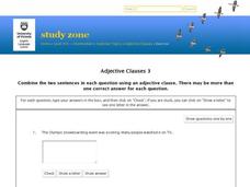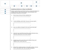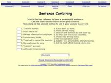 In this combining sentences worksheet, students complete a seven question on-line interactive page on joining sentences. Students read the two or three sentences and in the box, type the sentences that have been combined. Students check...