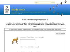 In this ESL conjunction worksheet, learners type the correct answer in a box, combining sentences using a subordinating conjunction. Students may click on "show a letter," "check" or "show answer" buttons.
