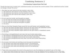 In this sentence structure worksheet, students combine two sentences to create a new compound sentence or a simple sentence with compound parts. Students eliminate unnecessary words as they combine and correctly punctuate their new...