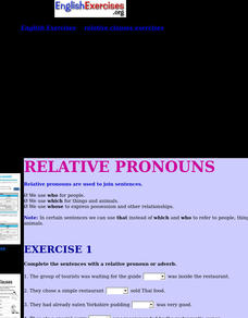 Four short exercises give learners the opportunity to review relative clauses including should, might, who, which, or that. They complete a fill in the blank activity first before forming complete sentences from a collection of phrases...
