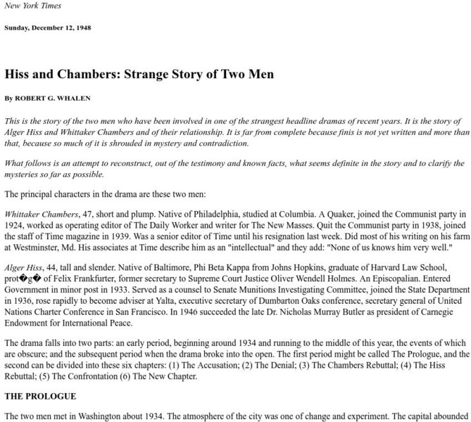 This site provides a New York Times article published in 1948, offering an investigation of the Chambers-Hiss accusation. Includes the following sections: the prologue, the accusation, the denial, the Chambers rebuttal, the Hiss...