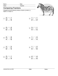In this comparing fractions worksheet, 5th graders solve 10 problems in which simple fractions with unlike denominators are compared using the signs: <, >, or =.