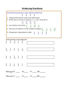 In this math worksheet, students examine the rules for ordering fractions by first changing to common denominators, then putting them from smallest to biggest. Students analyze 4 sets of fractions, change them to common denominators and...