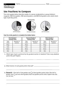 In this fractions worksheet, students use 3 circle graphs to complete 3 tables, then answer 3 questions, using the graphs to compare information in tables. Answers available on page 2.