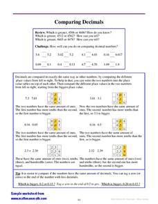 Part lesson, part worksheet, this handout walks math minors through the comparison of two decimal numbers. It teaches them the trick of tagging zeroes in to get the numbers to be the same length to better understand place value. A set of...
