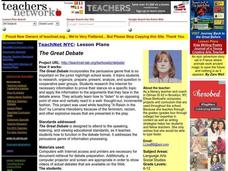 Groups of learners investigate the persuasive genre of writing as they research and present on an issue. They research the Internet (possible websites are included) for a topic and locate information to present to the opposing team. In...