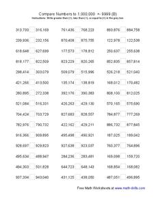 Learners use their math skills to compare 45 pairs of 6 digit numbers. They fill in the 45 blanks with greater than, less than, or equal to symbols.