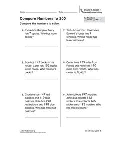 In this comparing numbers worksheet, students solve 6 word problems where they must order and compare numbers up to 200 in order to arrive at a solution.