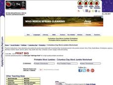 In this online interactive Columbus Day instructional activity, students examine 20 holiday-related words in a word bank. Students use the word bank to unscramble 20 sets of letters to match the terms in the word bank. This instructional...
