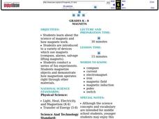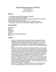 Students investigate the concepts of magnetism and its properties. They construct a magnet and test foods for iron content. Then students define the use of a motor and make their own electric motor while working in small groups. Then...