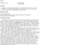 Students investigate the mixing of light. They form a hypotheses to reason why color changes occur and they write conclusions and ask new questions arising from the investigation. Students identify the primary and complementary colors of...