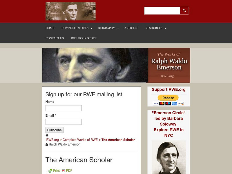 Read and listen to the complete text of Ralph Waldo Emerson's lecture, "American Scholar," delivered in 1837 to the Phi Beta Kappa Society at Cambridge.