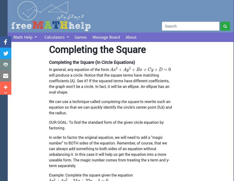 [Free Registration/Login may be required to access all resource tools.] Learn how to complete the square in order to solve quadratic equations.