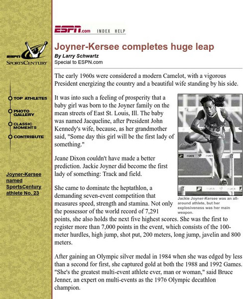 One of the greatest track and field athletes of all time, Jackie Joyner-Kersee won six Olympic medals. ESPN provides a profile of her life.