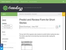 In this story comprehension worksheet, students fill out an organizer, making a prediction about a story before reading, and writing about what led them to this prediction. Students then complete another organizer, writing about setting,...