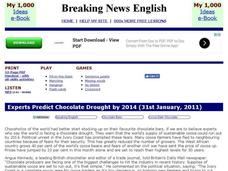 In this chocolate worksheet, students read the article, answer true and false questions, complete synonym matching, complete phrase matching, complete a gap fill, answer short answer questions, answer discussion questions, write, and...