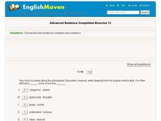 In this online interactive grammar skills instructional activity, learners examine 10 sentences that are missing words and select the appropriate words to complete each of the sentences and match them to the sentences. Student answers...