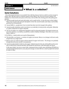 In this solutions learning exercise, students read about how people first learned to use metals and to combine metals to form alloys. Students write an essay telling the story of how ancient people first learned to cause physical changes...