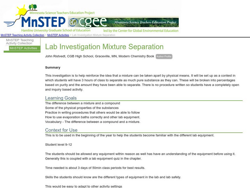 An inquiry lab where students try to separate as much as the pure substance they can in a set time period. This lab helps students understand that physical means can be used to take apart a mixture.