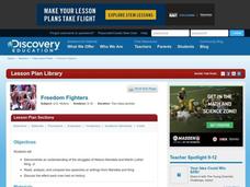 Students discover the accomplishments of Nelson Mandela and Martin Luther King, Jr. In this social justice lesson, students watch "Freedom Fighters," and then read speeches or writings made by each of the men. Students write compare and...
