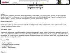 Students conduct a review of famous Americans for both grade levels. They practice cooperative writing and editing. Students use a word processing program and available editing tools. They use their knowledge of biographies and the...
