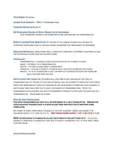 Seventh graders complete activities to perform transformations of various figures and describe the transformations. In this transformations instructional activity, 7th graders perform a translation, a rotation, and a reflection on graph...