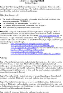 Students use the internet to research the various types of stone tools used by natives. Using this information, they create a chart describing each tool and its usage. In groups, they share their charts with others and answer...