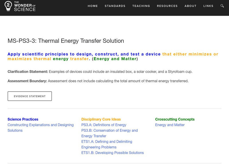 Lessons to show thermal energy transfer. Students will "apply scientific principles to design, construct, and test a device that either minimizes or maximizes thermal energy transfer".