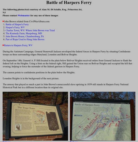 A brief description of the attack on Harpers Ferry along with maps of Confederate troop placements and photos of how it looks today.