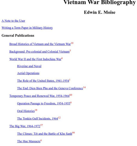 A great resource for print resources on the Vietnam War. The Table of Contents provide a good organizational tool of bibliographic information for anyone trying to understand the conflict.