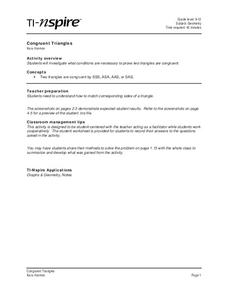 Young scholars explore the concept of congruent triangles. In this congruent triangles lesson plan, students use Cabri Jr. to construct two congruent triangles using circles. Young scholars determine if the two triangles are...