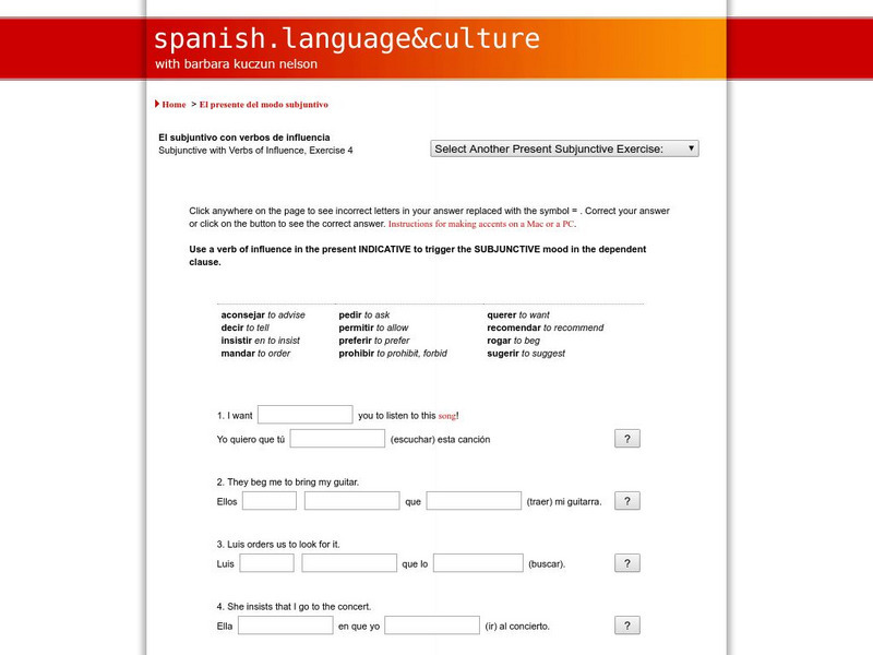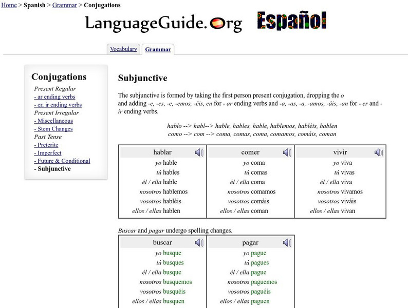 Learn the formation of regular and irregular verbs in the subjunctive tense and hear the correct Spanish pronunciation for each verb form. Three links to interactive verb conjugation practice activities give learners an opportunity to...