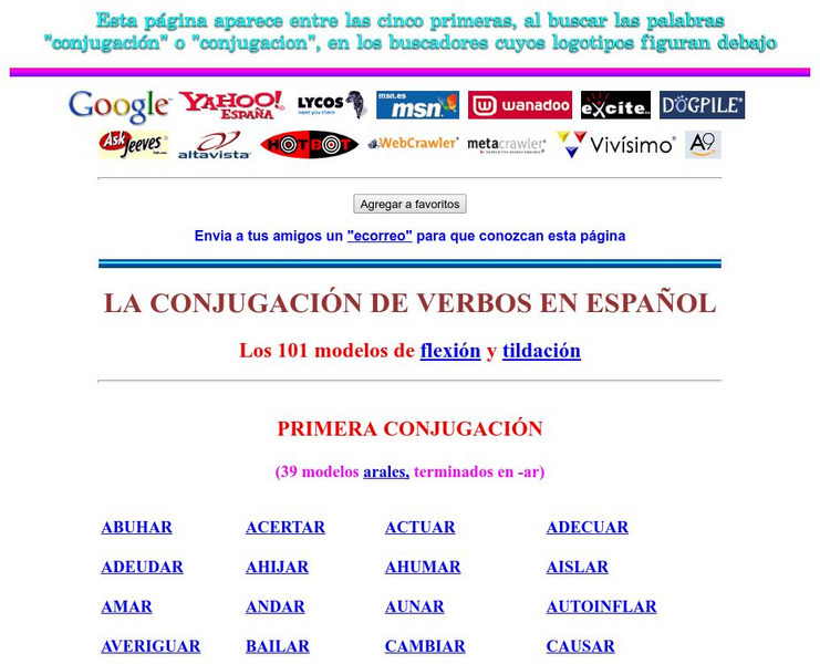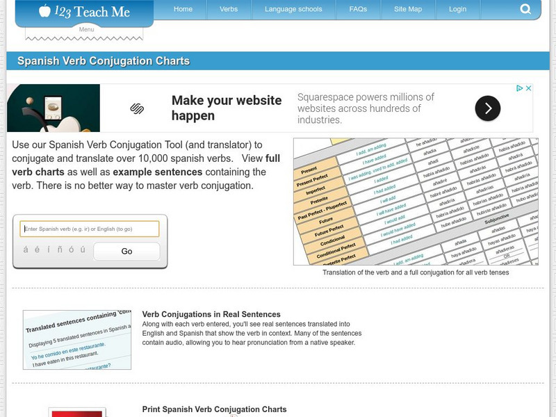 The purposes and applications of Spanish verb conjugations are explained on this site. Verb conjugations in " real sentences," printable verb charts, and a comprehensive list of Spanish verbs are included on this resource.