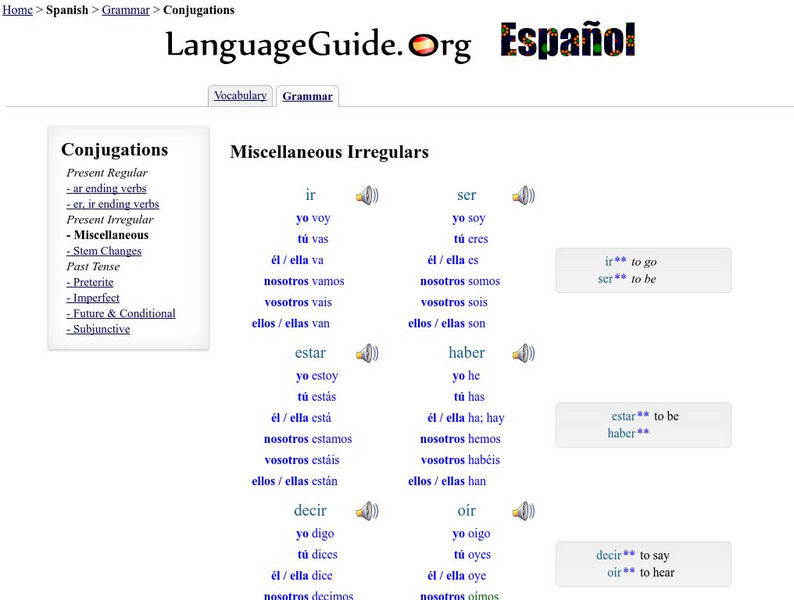 Learn how to write the correct forms of various irregular verbs such as ir, ser, estar, haber, decir, oir and more. Audio files model the correct pronunciation. Links to interactive conjugation practice give students more time for skill...