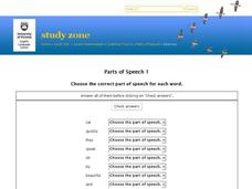 In this ESL parts of speech activity, students read words, then choose the correct part of speech from a drop down list. Students then click on a "check answer" button.