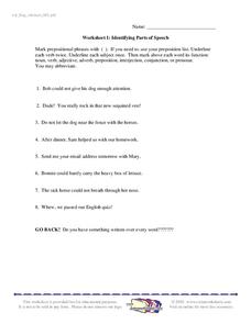 In this grammar worksheet, students master all parts of speech. Students complete 8 sentences, identifying every word and its purpose in each statement.