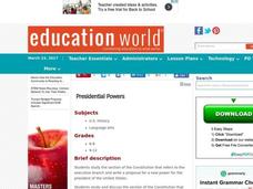 Students study and discuss the section of the Constitution that refers to the executive branch. They write a new section or clause describing a new duty for the president of the United States. Students define the word power and proposal.
