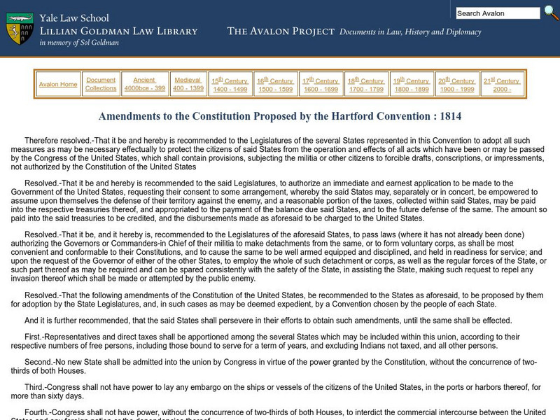 This is the text of the constitutional amendments proposed by the Hartford Convention in 1814, trying to get the federal government to give control of militias to the states and recognize other New England interests.