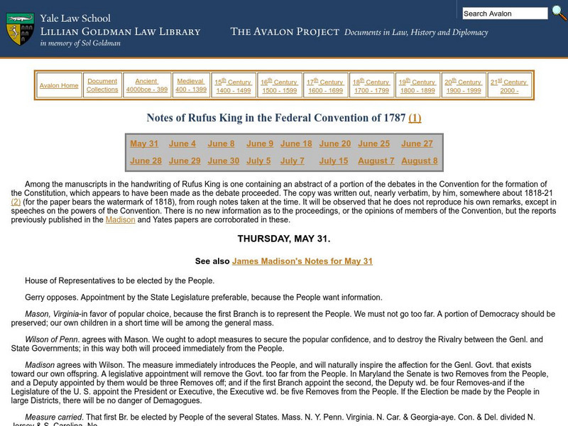 A transcript of the actual handwritten notes taken by Rufus King (delegate from Massachusetts) at the Constitutional Convention in 1787.