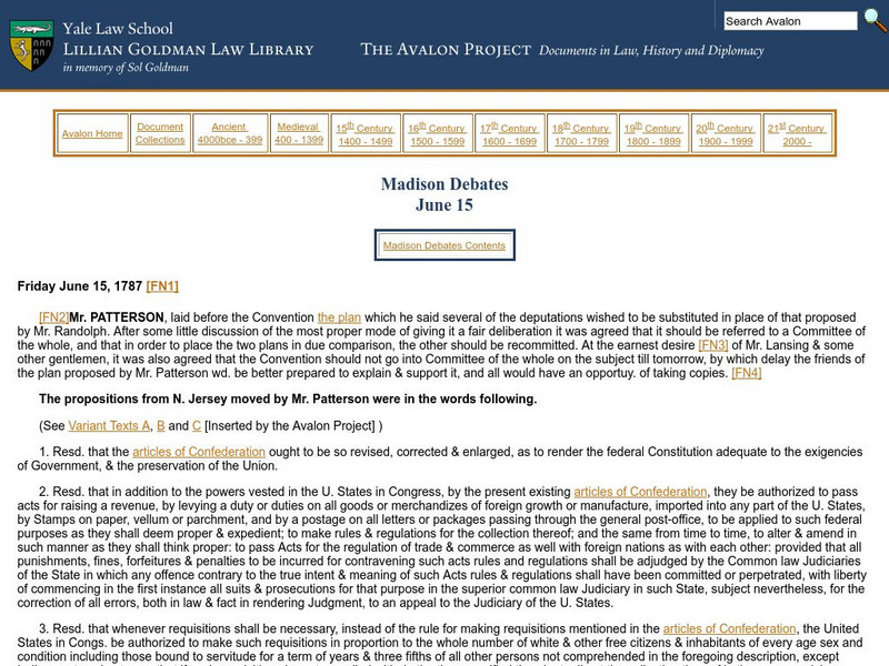 Read online from James Madison's report of William Patterson's proposal of the New Jersey Plan at the Federal Convention, 1787. Link to related document: Articles of Confederation as related specifically to each proposal in the New...