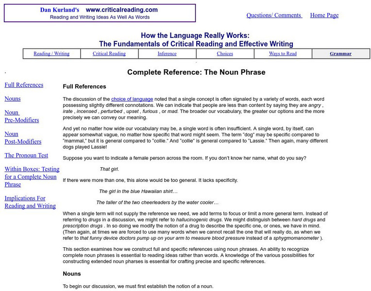 Part of a larger site on "The Fundamentals of Critical Reading and Effective Writing," this section on the noun phrase discusses pre-modifiers, post-modifiers, pronouns, construction of phrases, and more.