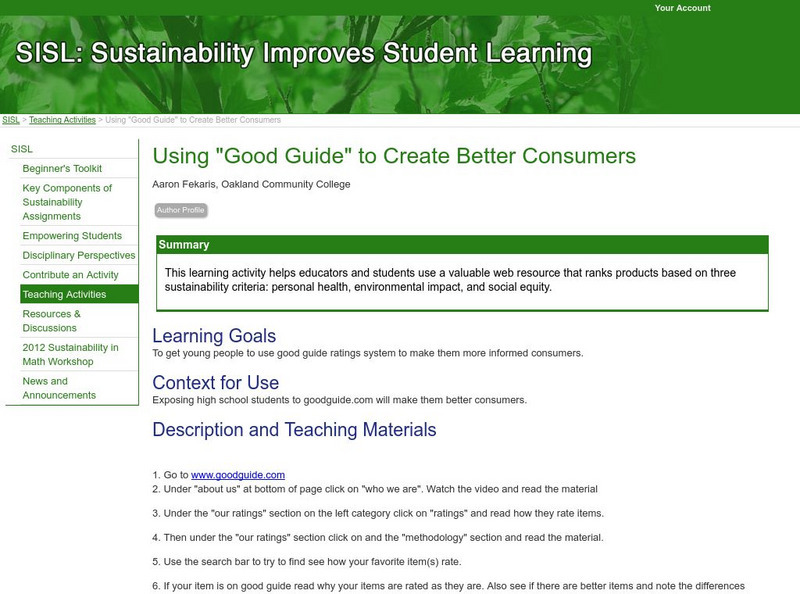 This learning activity helps educators and students use a valuable web resource that ranks products based on three sustainability criteria: personal health, environmental impact, and social equity.
