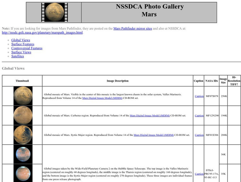 A huge collection of pictures of Mars, including shots from spacecraft and landers. Extensive coverage of controversial features like the "face on Mars" with comparison photos from Viking and Mars Global Surveyor.