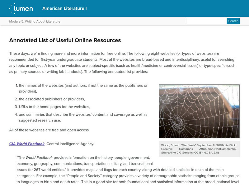 This page offers an annotated list of useful online resources including the names of the websites, the associated publishers or providers, URLs to the home pages for the websites, and summaries that describe the websites' content and...