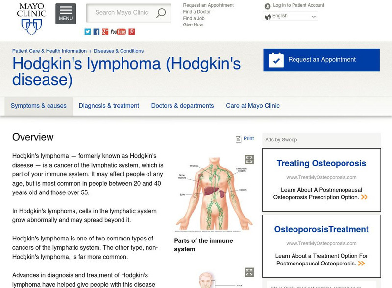 This site from the MayoClinic.com provides great information on the cancer of the lymphatic system known as Hodgkin's disease. The article includes facts on signs and symptoms, causes, treatment and coping skills.