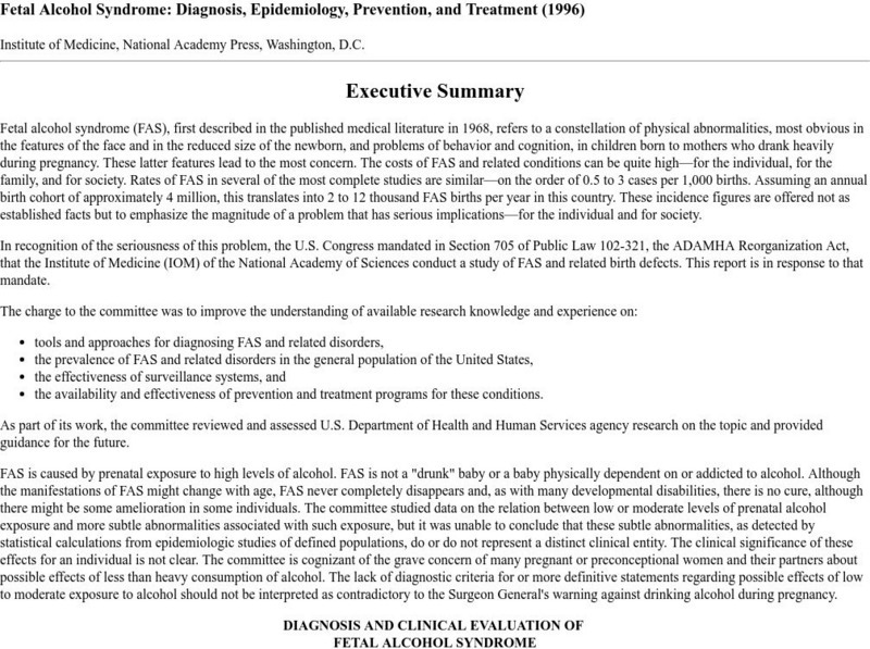 Read about a 1996 study on Fetal Alcohol Syndrome (FAS). Learn about how FAS is caused and detected, and how this disease can affect one's physical and cognitive development. Included, are recommendations for preventing FAS through...