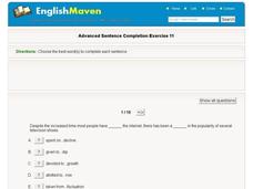 In this sentence completion worksheet, middle schoolers fill in the blank for the correct words for each sentence. Students complete 10 multiple choice questions. Click on "show all" to see the rest of the worksheet.