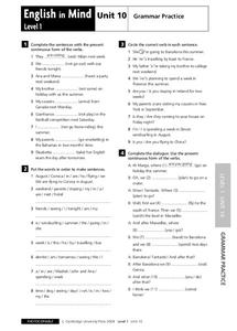 In this grammar practice worksheet, students determine how to put verbs in the present continuous form, put words in correct order to form a sentence, and choose the correct verb in a given sentence. Students answer twenty seven fill in...