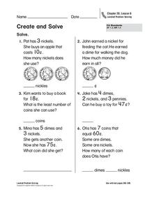 Give this to your second and third grade class to practice counting coins. There are six word problems given. Consider giving each learner a few dollars in coins to help kinesthetic learners. Also consider reviewing the word fewer before...