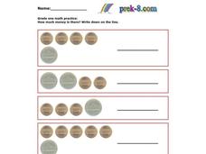 In this counting money worksheet, students practice counting coins. Students are given five sets of coins that they are to count and determine the amount of money pictured.
